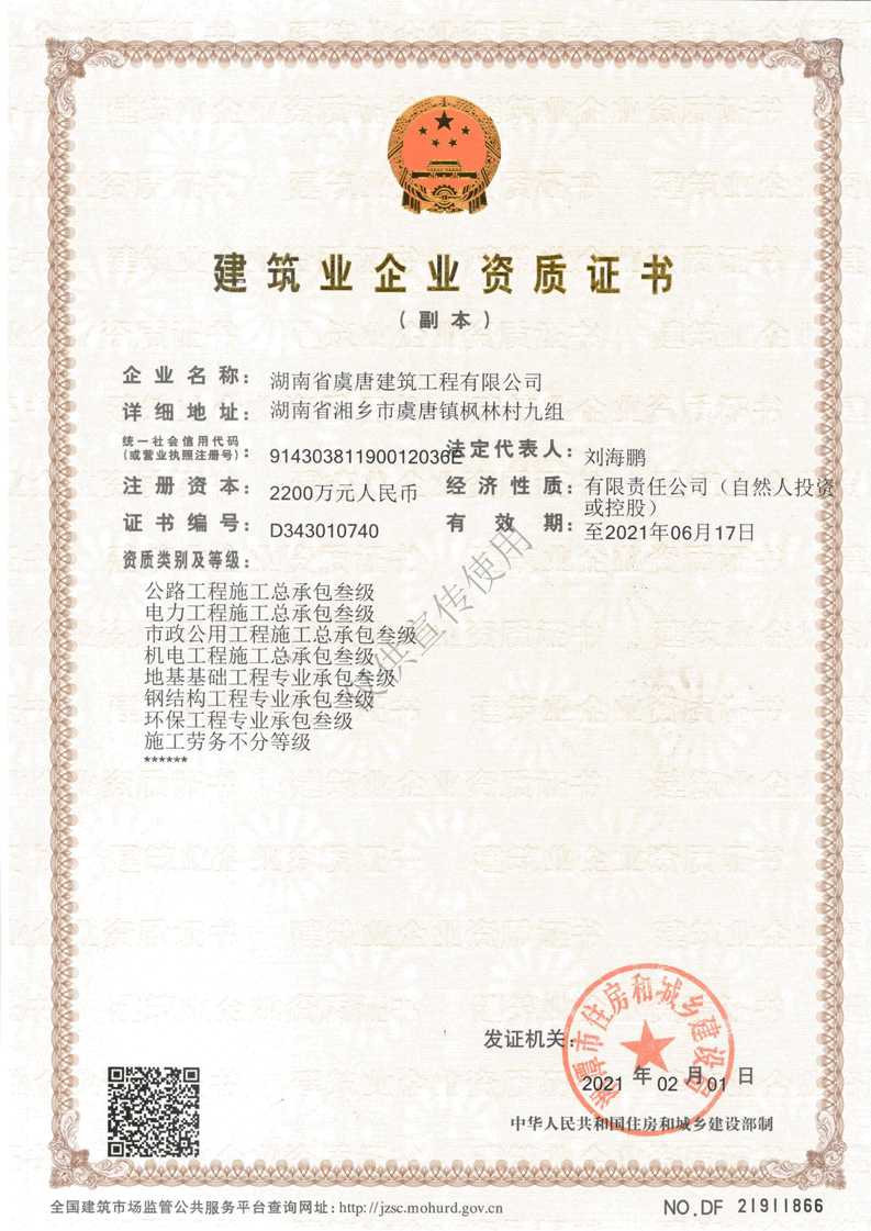 我公司具有建筑工程施工總承包貳級、消防設施工程專業承包貳級、建筑裝修裝飾專業承包壹級、特種工程(結構補強)專業承包不分等級、公路工程施工總承包叁級、電力工程施工總承包叁級、市政公用工程施工總承包叁級、機電工程施工總承包叁級、地基基礎工程專業承包叁級、  鋼結構專業承包叁級、環保工程專業工程承包叁級、承裝(修、試)電力設施四級、路面養護乙級資質、橋梁養護乙級資質、隧道養護乙級資質、交通安全設施養護乙級資質、施工勞務不分等級等多項施工資質。